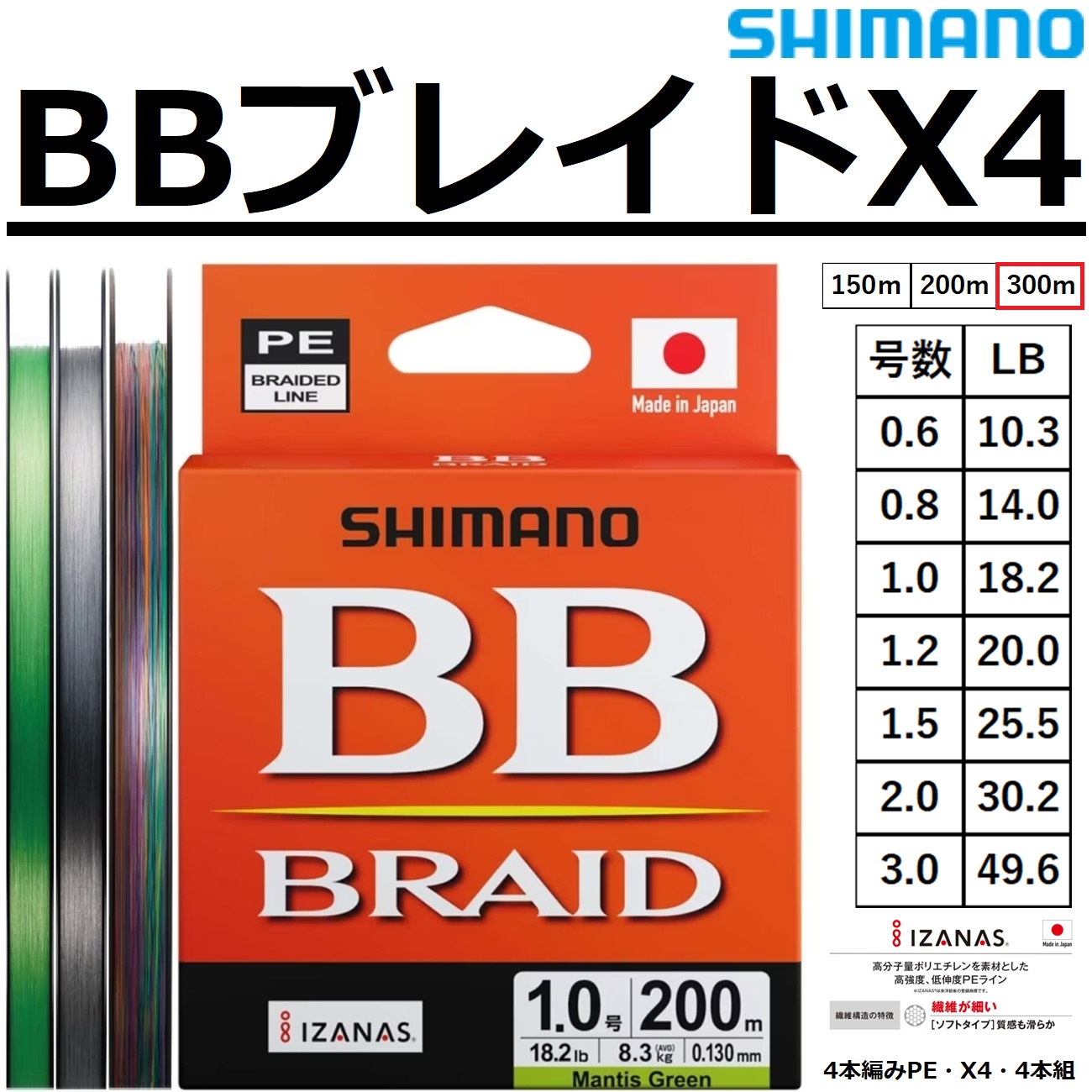 シマノ/SHIMANO BB ブレイド 300m 0.6, 0.8, 1, 1.2, 1.5, 2, 3号 LDM74Y 4本組PEライン 国産・日本製 LD-M74Y BBブレイド BB BRAID(メール便対応)