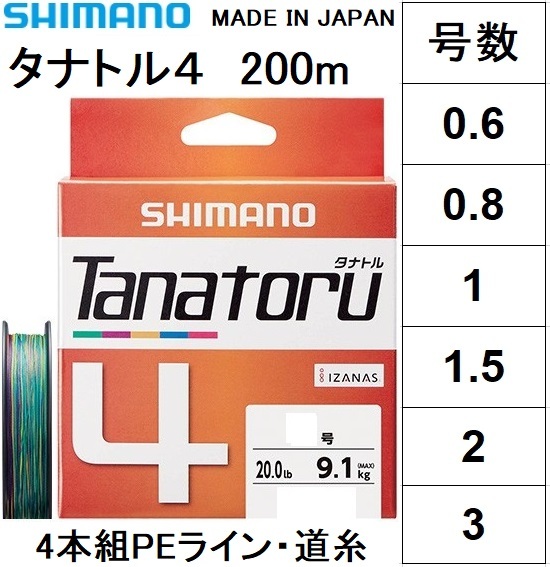シマノ/SHIMANO タナトル4 200m 0.6, 0.8, 1, 1.5, 2, 3号 PLF64R 4本組PEライン 国産・日本製 PL-F64R TANATORU4(メール便対応)