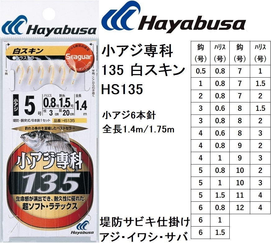ハヤブサ/Hayabusa 小アジ専科135 白スキン シラスカラー HS135 0.5,1,2,3,4,5,6,7,8,9,10,11,12号 小アジ6本針 1.4m/1.75m イワシ・サバ堤防サビキ仕掛