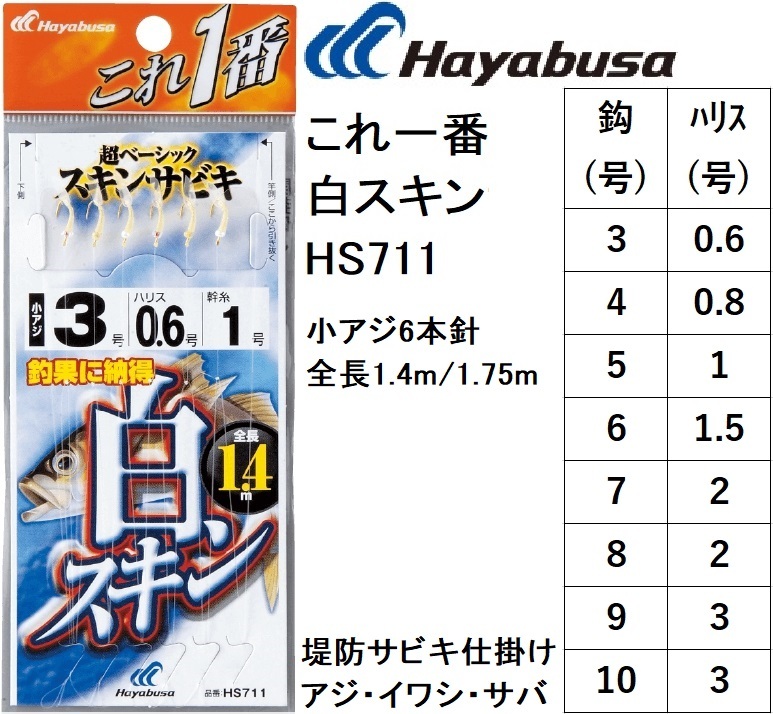 ハヤブサ/Hayabusa これ一番 白スキンサビキ HS711 3, 4, 5, 6, 7, 8, 9, 10号 小アジ6本針 1.4m/1.75m アジ・イワシ・サバ・コノシロ用堤防サビキ仕掛け