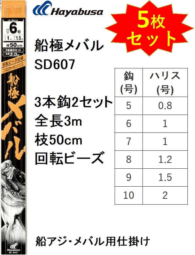 (5枚セット)ハヤブサ/Hayabusa 船極メバル 3本鉤2セット SD607 枝50cm 回転ビーズ 5, 6, 7, 8, 9, 10号 アジ・メバル用船仕掛け 3本針(メール便対応)