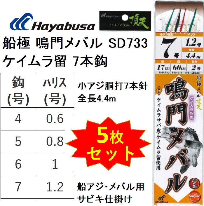 (5枚セット)ハヤブサ/Hayabusa 船極頂天 鳴門メバル ケイムラ留 SD733 鱗ケイムラサバ皮 小アジ胴打7本鈎 全長4.4m 4, 5, 6, 7号 アジ・メバル用船サビキ