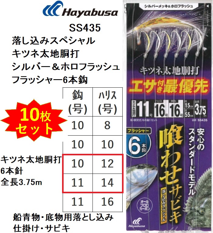 (10枚セット)ハヤブサ/Hayabusa 落し込みスペシャル キツネ太地胴打 シルバー&ホロフラッシュ フラッシャー6本鈎 SS435 10-12, 11-14号 青物・底物サビキ仕掛け