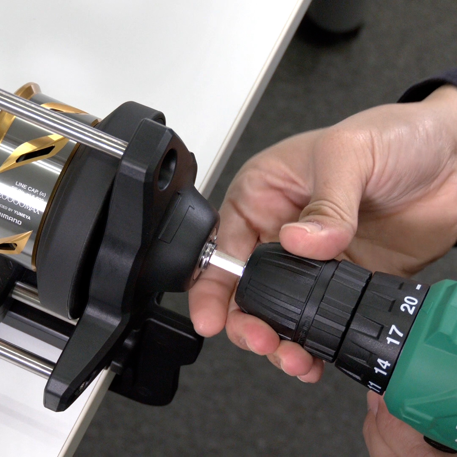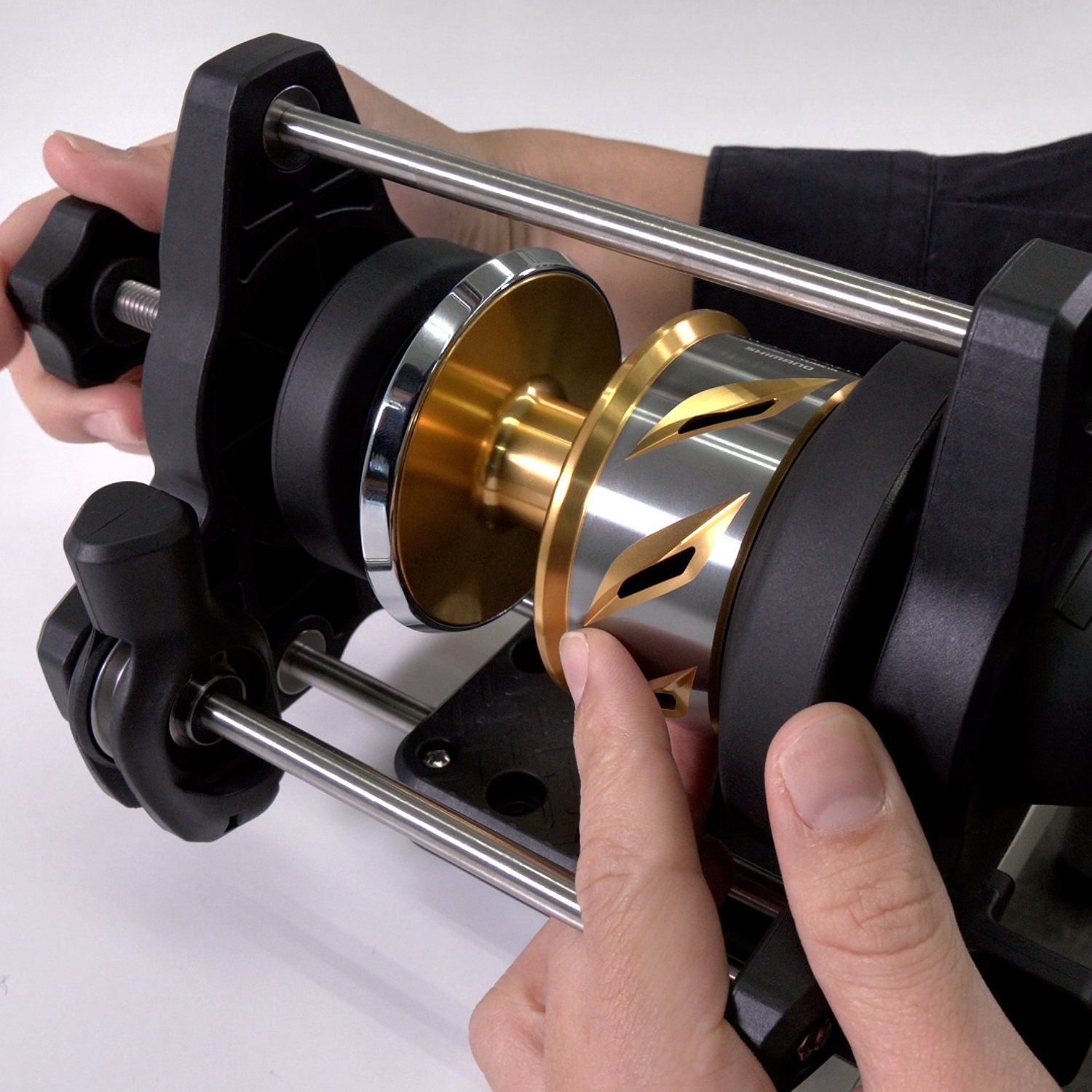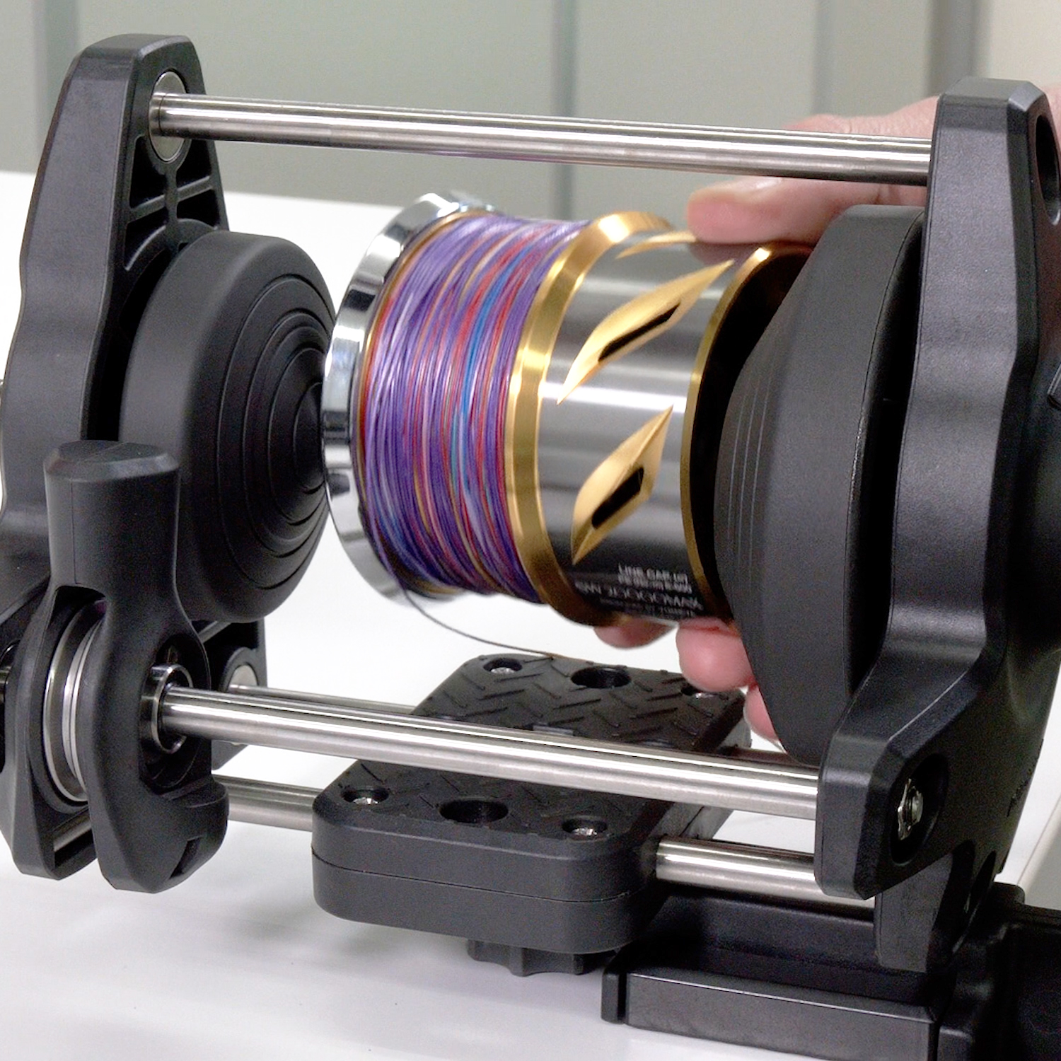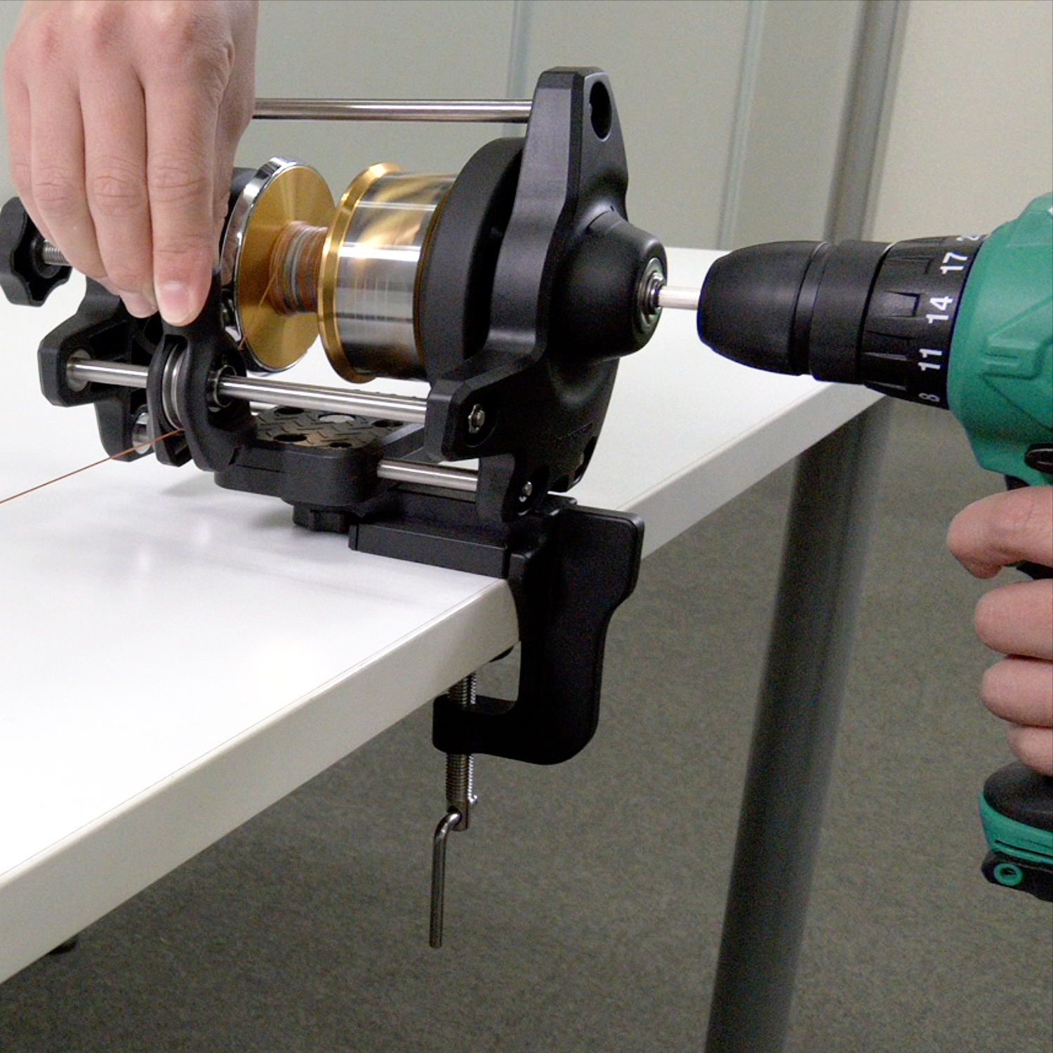 大型スピニングリールからスプールを取り外しセットすることで、電動ドライバーの力で高負荷でも楽々糸巻!
