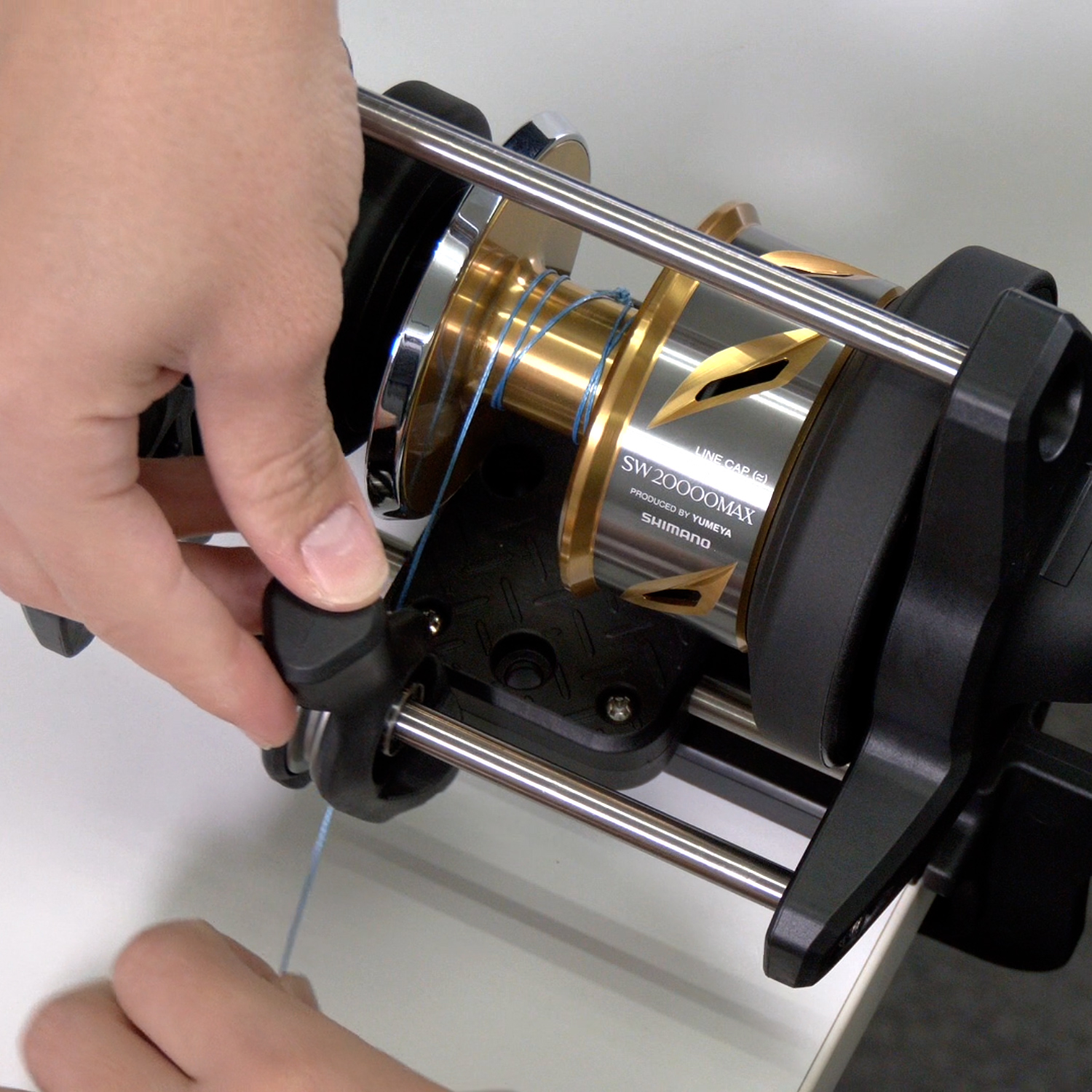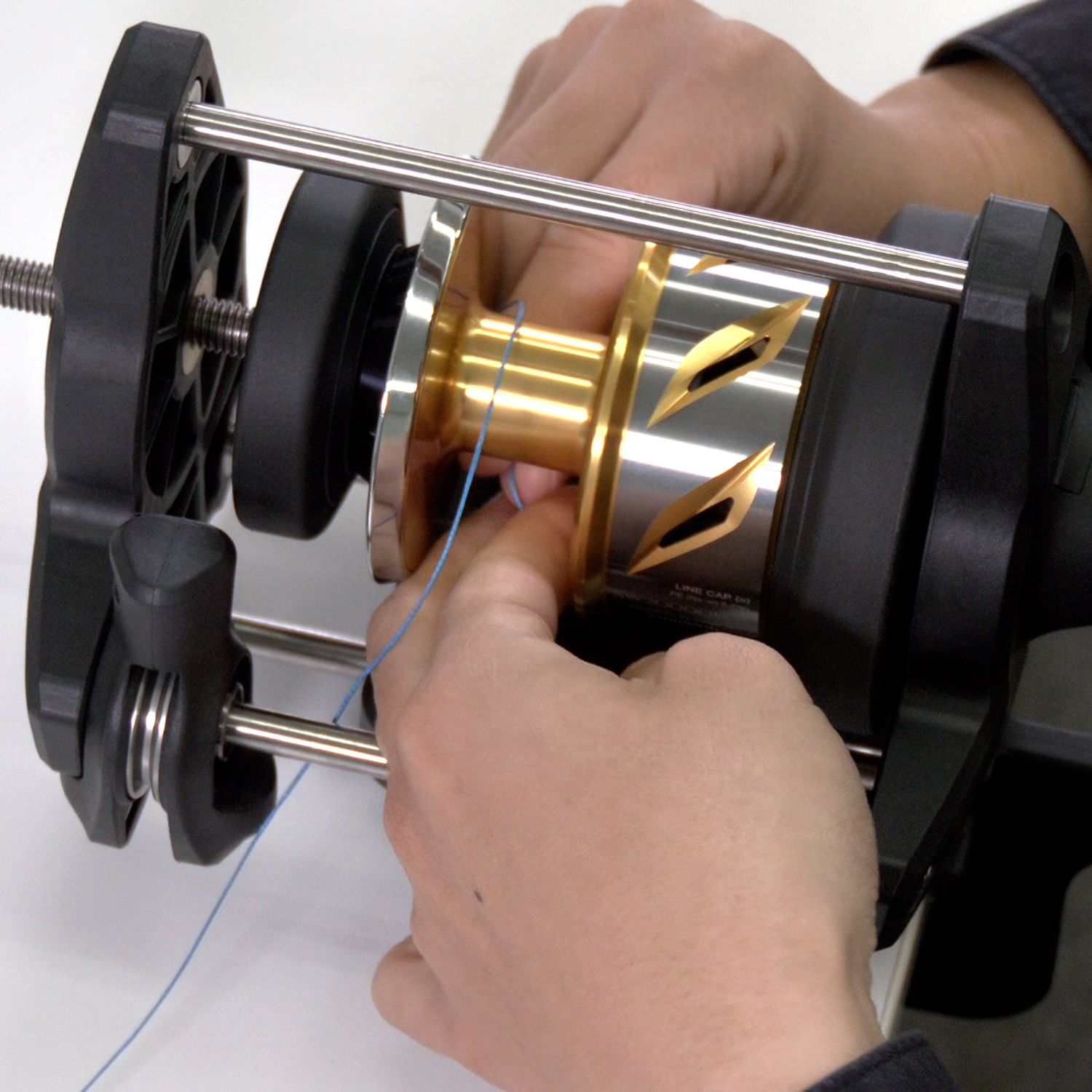 ラインをガイドシャフトの下をくぐらせ、スピニングリールのスプールに上から巻きつけます。