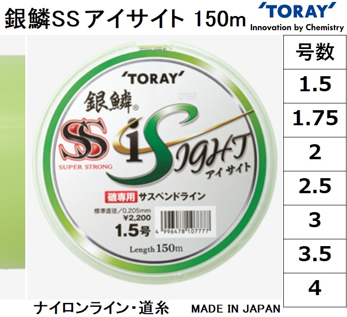 東レ/TORAY 銀鱗SS アイサイト 150m 1.5, 1.75, 2, 2.5, 3, 4号 ナイロンライン・道糸 日本製・国産 ギンリンスーパーストロング(メール便対応)