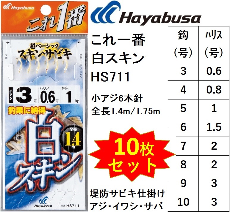 (10枚セット)ハヤブサ/Hayabusa これ一番 白スキンサビキ HS711 3, 4, 5, 6, 7, 8, 9, 10号 小アジ6本針 1.4m/1.75m アジ・イワシ・サバ用堤防サビキ仕掛け