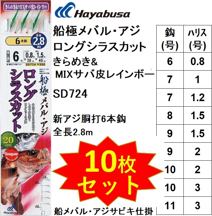 (10枚セット)ハヤブサ/Hayabusa 船極メバル・アジ ロングシラスカットきらめき&MIXサバ皮レインボー SD724 新アジ胴打6本鈎 2.8m 6,7,8,9,10,11号船用サビキ