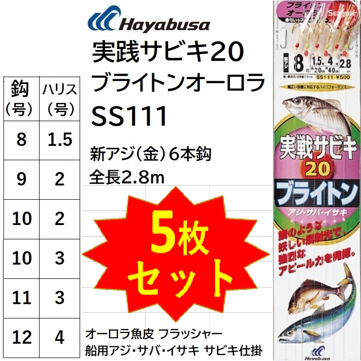 (5枚セット)ハヤブサ/Hayabusa 実戦サビキ20 ブライトンオーロラ SS111 新アジ6本鈎(金) 全長2.8m フラッシャー アジ・サバ・イサキ船用サビキ仕掛け