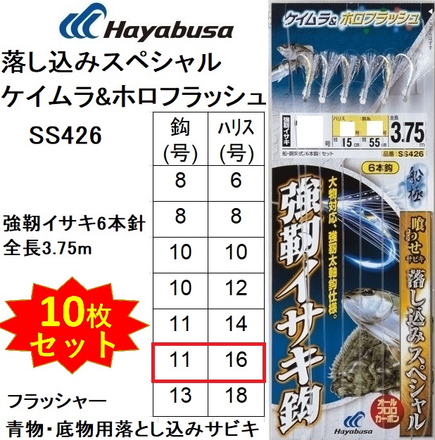 『SS426・SS427』には太ハリス対応で大物の強烈なパワーにもビクともしない、喰わせ専用設計鈎の「強靭イサキ鈎」を使用しています。また、キラメキをさらにパワーアップさせる為、鈎全体にはケイムラコートを施し、フラット部分にはフラッシングホロシールを直貼りしました。