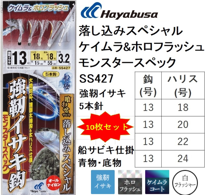 『SS426・SS427』には太ハリス対応で大物の強烈なパワーにもビクともしない、喰わせ専用設計鈎の「強靭イサキ鈎」を使用しています。また、キラメキをさらにパワーアップさせる為、鈎全体にはケイムラコートを施し、フラット部分にはフラッシングホロシールを直貼りしました。