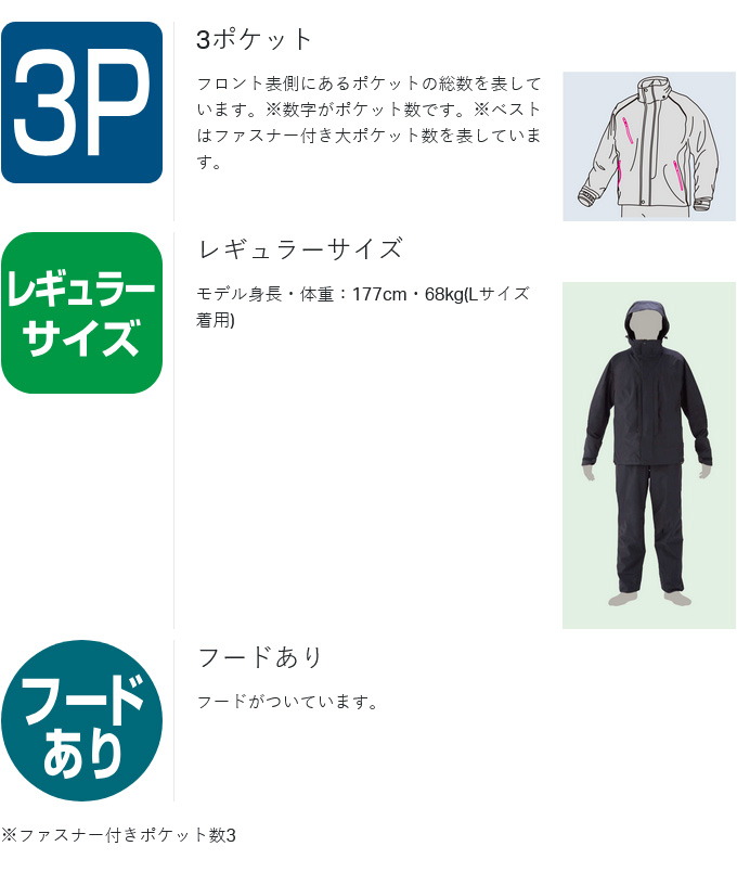 フロント表側にあるポケットの総数を表しています。※数字がポケット数です。※ベストはファスナー付き大ポケット数を表しています。