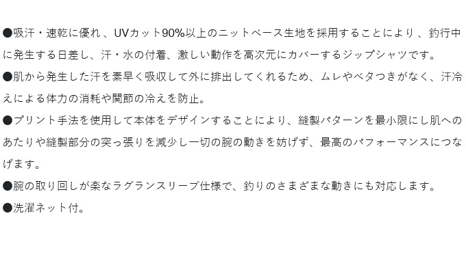 ●吸汗・速乾に優れ 、UVカット90%以上のニットベース生地を採用することにより 、釣行中に発生する日差し、汗・水の付着、激しい動作を高次元にカバーするジップシャツです。