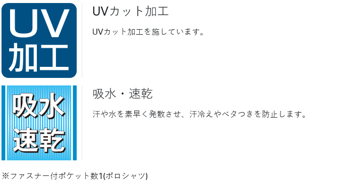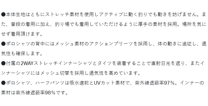 ●ポロシャツ、ハーフパンツは吸水速乾とUVカット素材で、紫外線遮蔽率97%。インナーの素材は紫外線遮蔽率98%です。