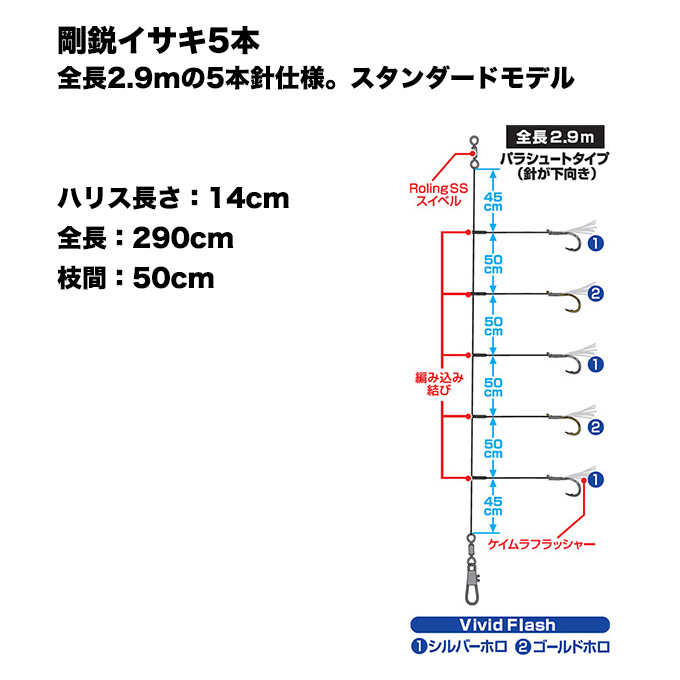 針の胴打ち部分に光沢のあるホログラムシールを直貼りし、ベイト(エサ)掛かりが飛躍的にアップする仕様になっている。