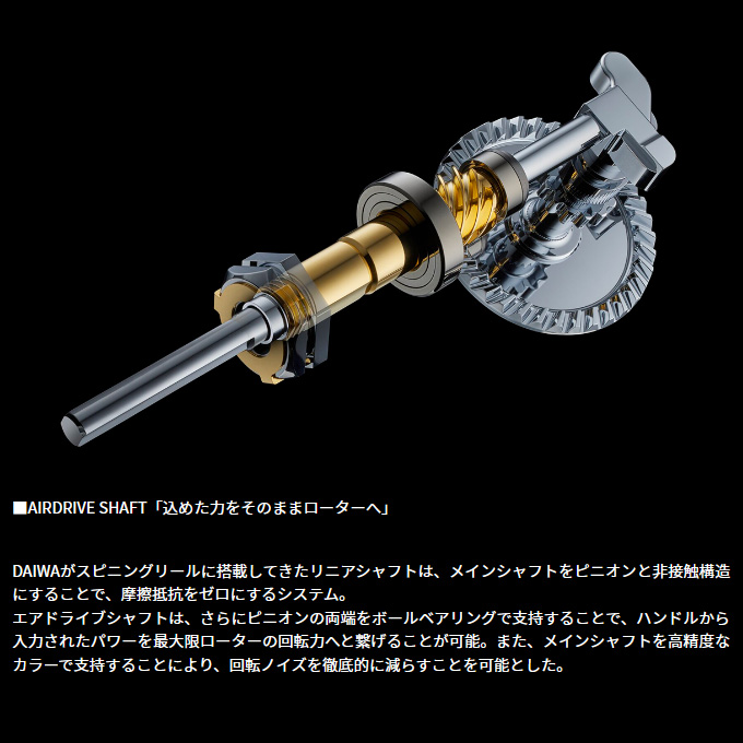 アルミ製のフルメタルボディに特殊表面処理を施されたドライブギアを組み込み、メインシャフトにSUSを採用することで、パワーロスすることなく、パフォーマンスを最大限に発揮する。