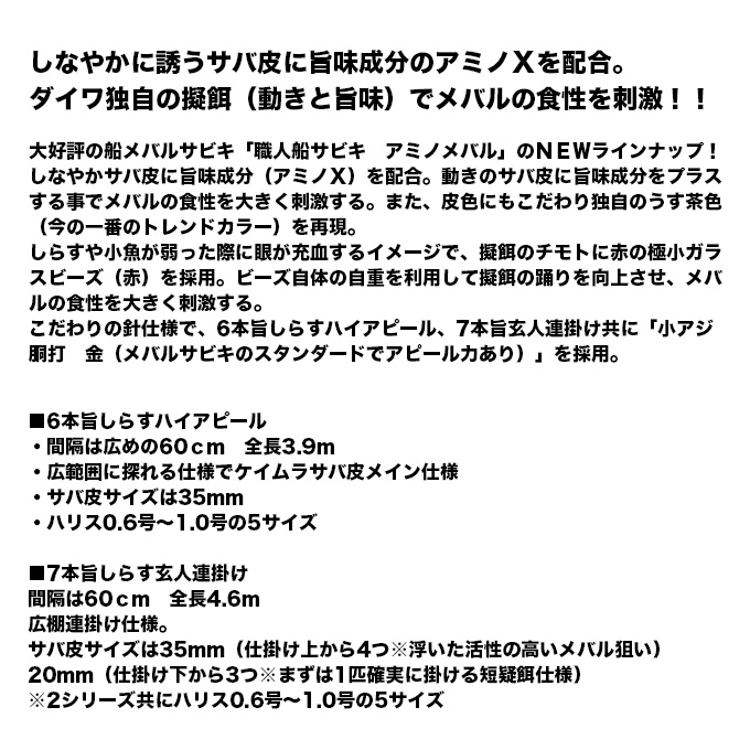 しなやかに誘うサバ皮に旨味成分のアミノXを配合。ダイワ独自の擬餌(動きと旨味)でメバルの食性を刺激!!