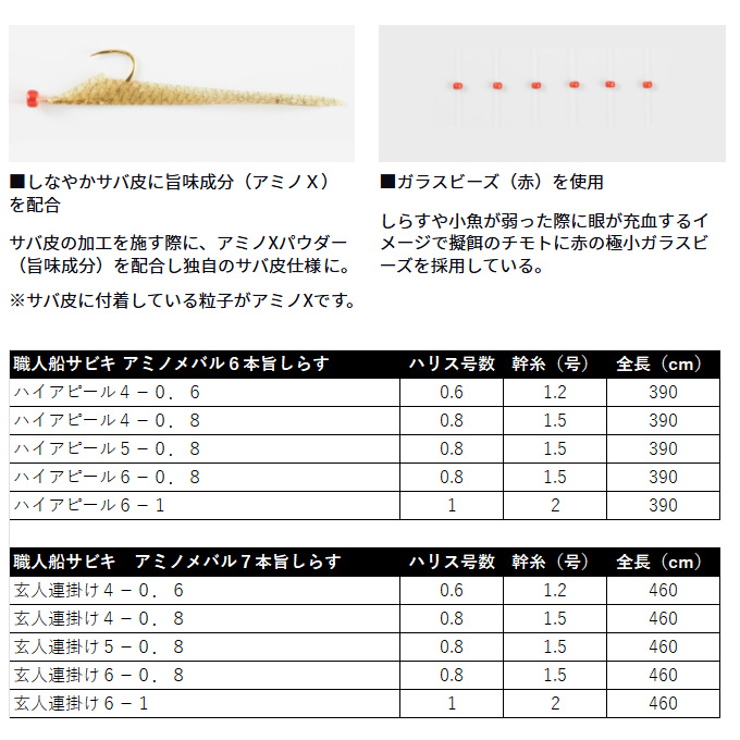 こだわりの針仕様で、6本旨しらすハイアピール、7本旨玄人連掛け共に「小アジ胴打 金(メバルサビキのスタンダードでアピール力あり)」を採用。