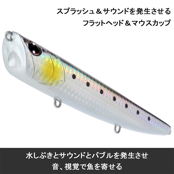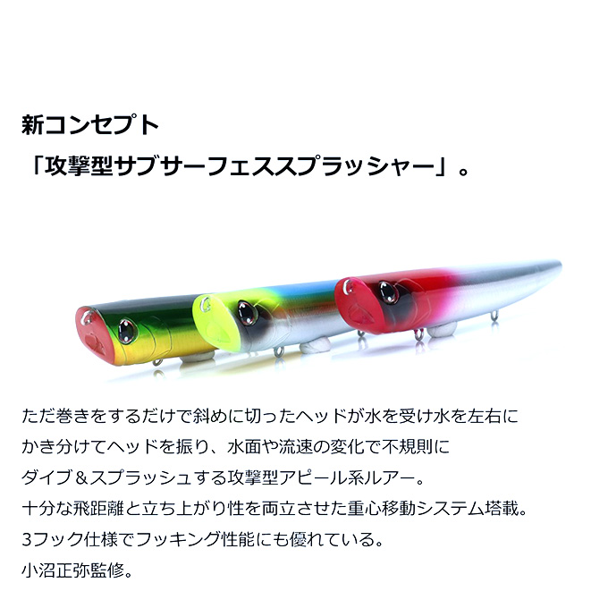 ただ巻きをするだけで斜めに切ったヘッドが水を受け水を左右にかき分けてヘッドを振り、水面や流速の変化で不規則にダイブ&スプラッシュする攻撃型アピール系ルアー。十分な飛距離と立ち上がり性を両立させた重心移動システム塔載。3フック仕様でフッキング性能にも優れている。小沼正弥監修。