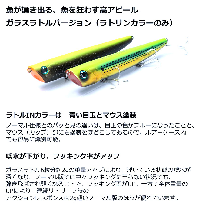 6つのガラスラトルを内蔵したラトルIN仕様。ストップ時、ゴー時の度に「チロリンッ」と高サウンドを発生し、魚を水面まで引き寄せると同時に、位置情報を明確にすることでミスバイト率を軽減。