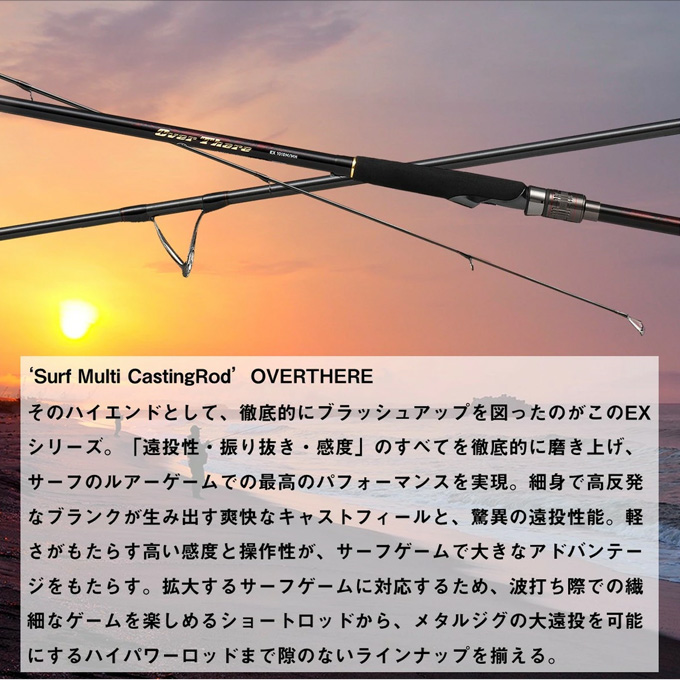 徹底的にブラッシュアップを図ったのがこのEXシリーズ。「遠投性・振り抜き・感度」のすべてを磨き上げ、サーフのルアーゲームでの最高のパフォーマンスを実現。細身で高反発なブランクが生み出す爽快なキャストフィールと、驚異の遠投性能。軽さがもたらす高い感度と操作性が、サーフゲームで大きなアドバンテージをもたらす。
