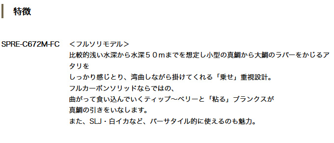 浅い水深をメインとして活躍し、感度・粘り・追従性能が良く、バラしにくいのが特徴。