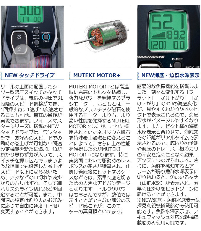 ライトゲームの軽快感に3000クラスのパワーと高耐久性を融合させてフォースマスター1000がモデルチェンジ。快適なワンハンド操作を実現するため、NEWタッチドライブとスピードクラッチを搭載。MUTEKI MOTOR+は圧倒的な巻上力と瞬発力を発揮。また高耐久性を追求し、ビーストマスター1000EJ同様の強化ギアシステムを採用しました。パワー、スピード、タフネス。すべてがサイズを超えたスパルタン仕様。手持ちでパワーファイトに挑む釣り人へお届けします。