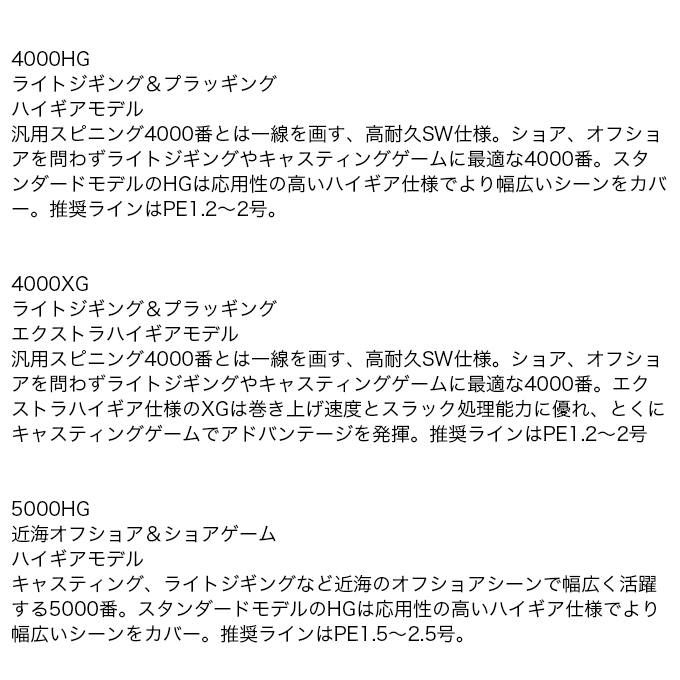 汎用スピニング4000番とは一線を画す、高耐久SW仕様。ショア、オフショアを問わずライトジギングやキャスティングゲームに最適な4000番。スタンダードモデルのHGは応用性の高いハイギア仕様でより幅広いシーンをカバー。推奨ラインはPE1.2〜2号。