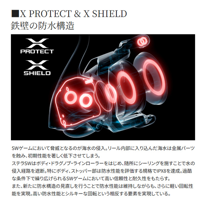 国内外で数多の実績をあげてきたステラSWが数々のテクノロジーとともにモデルチェンジ。XXタフドラグによるドラグ性能の向上、インフィニティループによるキャスタビリティの向上、インフィニティクロスによるギア強度・耐久性の向上、アンチツイストフィンによるライントラブルの防止など、さらなるアドバンテージをプラス。また、ハンドルノブへの防水シールの追加、ドラグノブの大径化など細部に至るまでブラッシュアップ。ソルトウォーターシーンで大物と真っ向から対峙するための性能にさらなる磨きをかけ、新生ステラSWが解き放たれる。