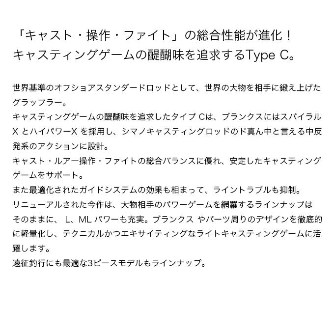世界基準のオフショアスタンダードロッドとして、世界の大物を相手に鍛え上げたグラップラー。キャスティングゲームの醍醐味を追求したタイプ Cは、ブランクスにはスパイラルX とハイパワーX を採用し、シマノキャスティングロッドのド真ん中と言える中反発系のアクションに設計。キャスト・ルアー操作・ファイトの総合バランスに優れ、安定したキャスティングゲームをサポート。また最適化されたガイドシステムの効果も相まって、ライントラブルも抑制。リニューアルされた今作は、大物相手のパワーゲームを網羅するラインナップはそのままに、 L、ML パワーも充実。ブランクス やパーツ周りのデザインを徹底的に軽量化し、テクニカルかつエキサイティングなライトキャスティングゲームに活躍します。