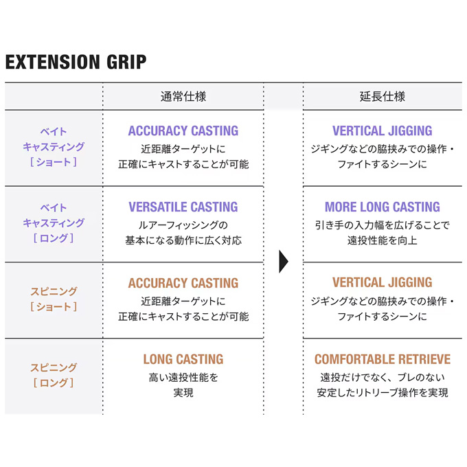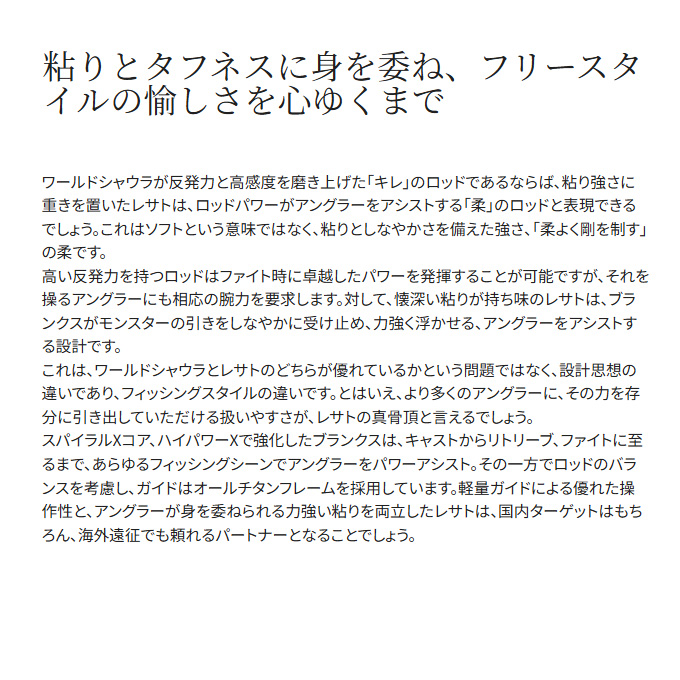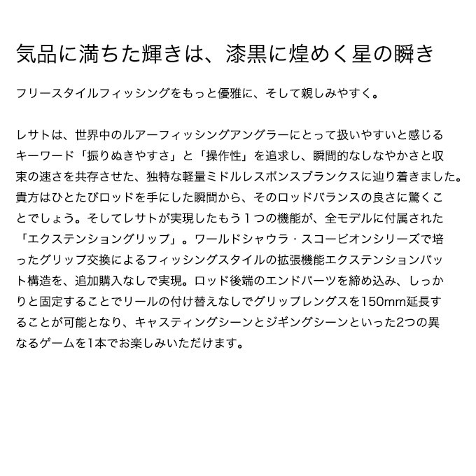 レサトは、世界中のルアーフィッシングアングラーにとって扱いやすいと感じるキーワード「振りぬきやすさ」と「操作性」を追求し、瞬間的なしなやかさと収束の速さを共存させた、独特な軽量ミドルレスポンスブランクスに辿り着きました。そして全モデルに「エクステンショングリップ」を付属。