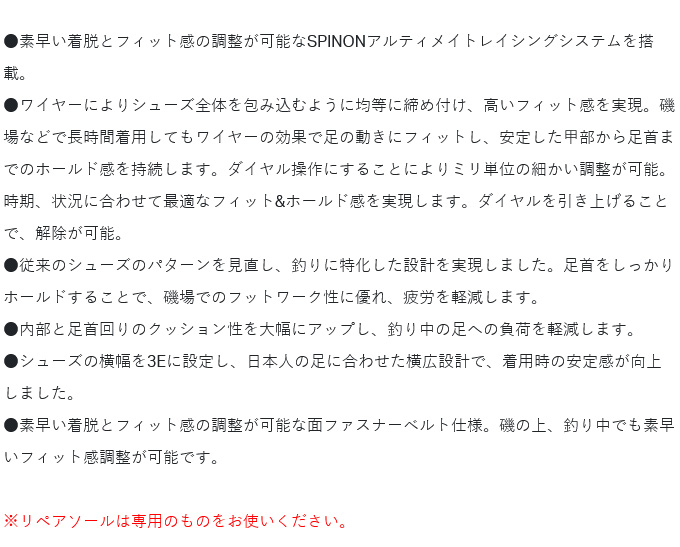 ●ワイヤーによりシューズ全体を包み込むように均等に締め付け、高いフィット感を実現。磯場などで長時間着用してもワイヤーの効果で足の動きにフィットし、安定した甲部から足首までのホールド感を持続します。ダイヤル操作にすることによりミリ単位の細かい調整が可能。時期、状況に合わせて最適なフィット&ホールド感を実現します。ダイヤルを引き上げることで、解除が可能。