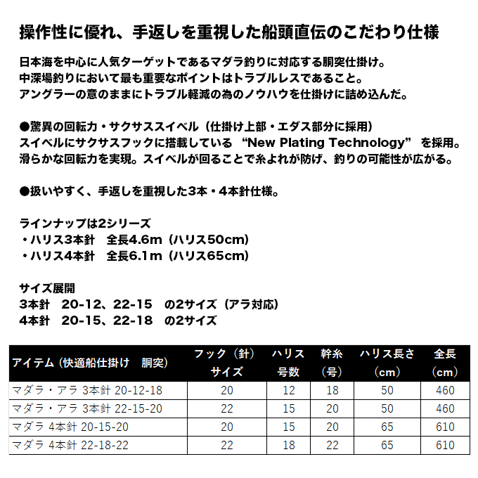 日本海を中心に人気ターゲットであるマダラ釣りに対応する胴突仕掛け。