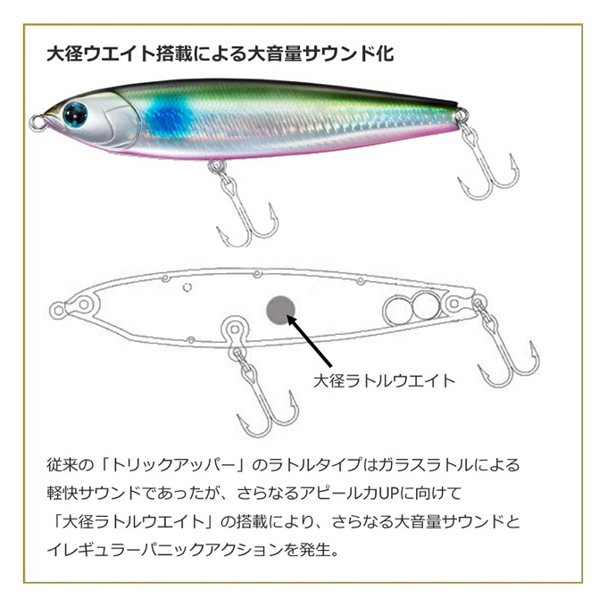 強烈な「水面を叩きつける音」に「重低音ラトルサウンド」をプラス!集魚性能UP+シーバスの捕食スイッチを入れる。(ボーン素材ボディ+大径ラトルウエイト+カップマウス)×立ち姿勢により、激しいサウンドとスプラッシュを発生。マウスカップが生む泡の軌跡が魚を寄せる!!連続トゥイッチでイレギュラー&ダイブ、トリッキーアクションが混ざったドッグウオーク=パニックアクションが簡単に発生する。移動幅が大きすぎないドッグウォークアクションを設定。リア重心で安定した飛行距離。65Fはチニングにもオススメ。130Fは立ち姿勢を水平気味にし、ドッグウォークアクションのしやすさを追求した。