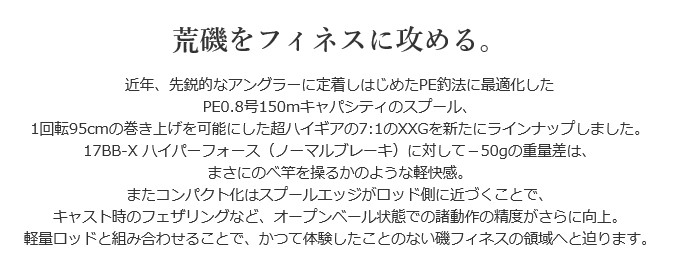 BB-Xハイパーフォース・コンパクトがモデルチェンジ。わずか190g、シマノスピニングリール最小の#1000ボディに新たに組み込まれたのはXXGという攻撃的な超高速ギア。重量から解き放たれたかのような軽快感のなかにもBB-Xテクニウムで磨かれた伝統の「荒磯」クオリティが宿る。強さと速さを備える精密冷間鍛造のHAGANEギアやテクニウムブレーキレバー、鉄壁の防水構造Xプロテクトをはじめ、サイズを超える機能を凝縮。すべてに進化したBB-Xハイパーフォース・コンパクトモデルが、再びフカセ釣りの新たな流れをつくります。