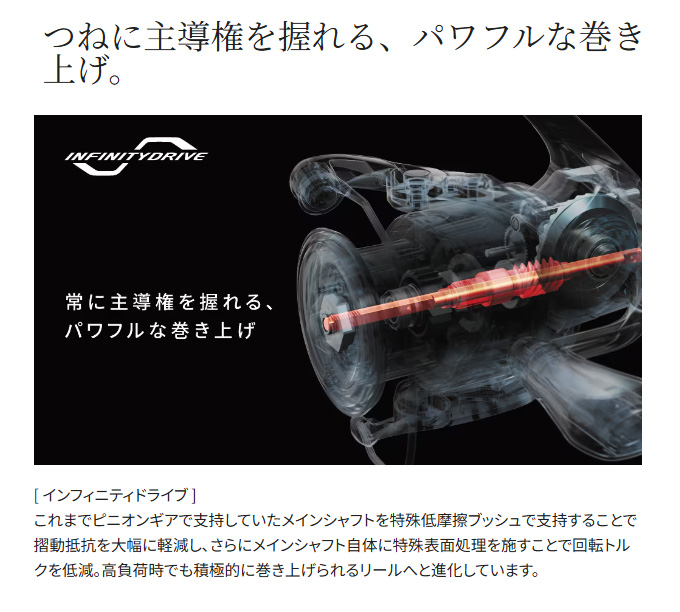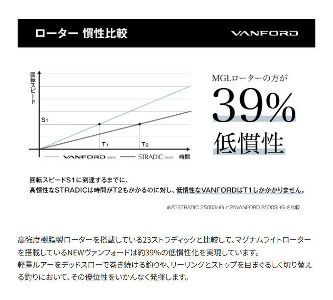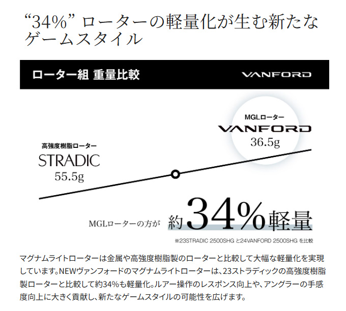 軽快さとリーリングのレスポンスを追求したマグナムライトシリーズの中核モデルとして、テクニカル系、フィネス系をはじめ幅広いゲームで活躍するヴァンフォード。NEWモデルは前作の軽快な操作性と感度、心地良い巻き感を受け継ぎつつも、インフィニティクロス、インフィニティドライブの搭載でパワフルな巻き上げとギアの耐久性がいっそう向上。耐摩耗性に優れたデュラクロスの採用により、ドラグの耐久性もシマノ基準で従来比約 10 倍と大きく向上しています。また、新搭載のアンチツイストフィンがライントラブルを抑制し、快適な使いごこちがさらに加速。新登場のC2500SXGを含む全 13アイテムはエリアトラウト、バスフィッシングからエギング、シーバス、ショアジギングまでをカバーし、新時代のルアーゲームにふさわしいラインナップとなっています。