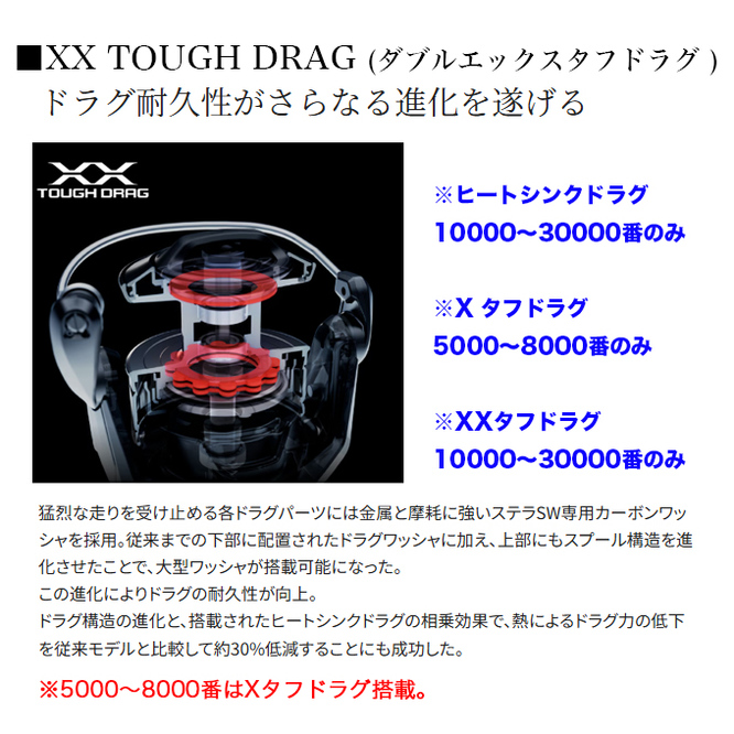 国内外で数多の実績をあげてきたステラSWが数々のテクノロジーとともにモデルチェンジ。XXタフドラグによるドラグ性能の向上、インフィニティループによるキャスタビリティの向上、インフィニティクロスによるギア強度・耐久性の向上、アンチツイストフィンによるライントラブルの防止など、さらなるアドバンテージをプラス。また、ハンドルノブへの防水シールの追加、ドラグノブの大径化など細部に至るまでブラッシュアップ。ソルトウォーターシーンで大物と真っ向から対峙するための性能にさらなる磨きをかけ、新生ステラSWが解き放たれる。