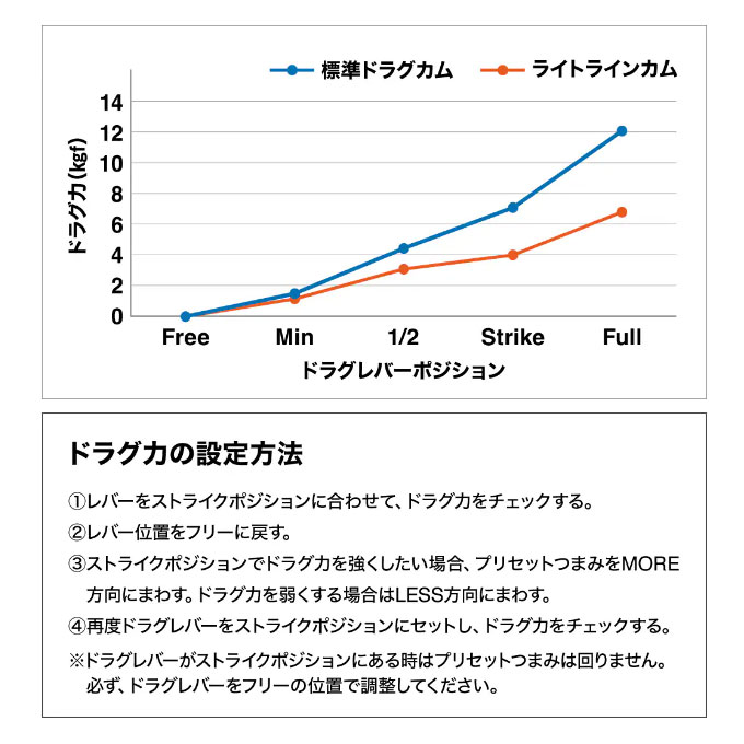 ※最大ドラグ力とはプリセットツマミをスプールフリーが出なくなる直前まで締めたときのFULLポジションでのドラグ力です。