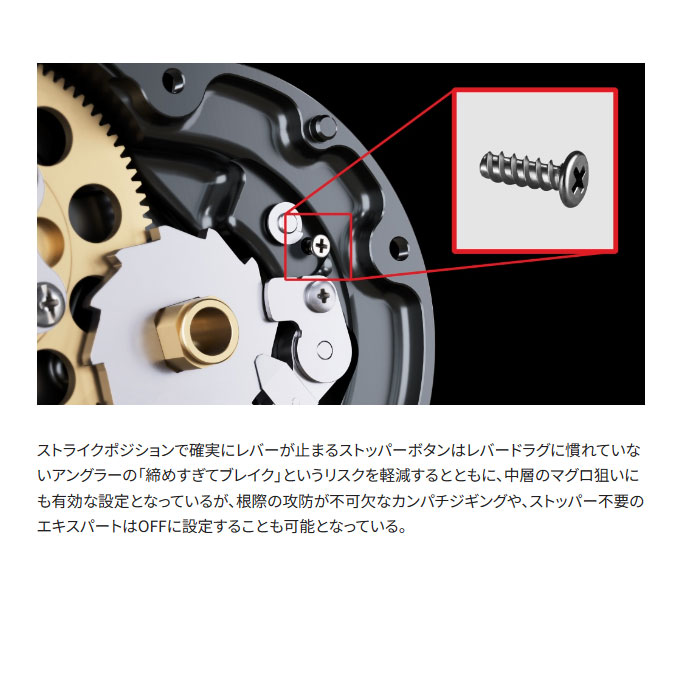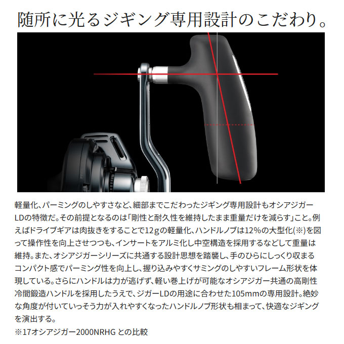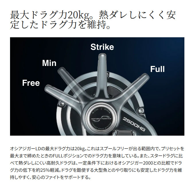 レバードラグはドラグ操作が視覚的にも操作しやすいのはもちろん、熱ダレしにくいドラグ性能は長時間ファイトが多くなるマグロにも最適。レバードラグは構造上ドラグ力を上げるほどハンドル回転が重くなるが、新開発インフィニティドライブ構造により、高ドラグ時のハンドル回転重さを従来比30%低減。大型魚と対峙するNew大型T型ハンドルノブと105mm冷間鍛造ハンドル、サミングのしやすいフレーム形状、操作性にこだわったドラグレバーなど、オシアジガーシリーズのこだわりを詰め込んだレバードラグリールです。ライトラインにも対応する付属ドラグカム。