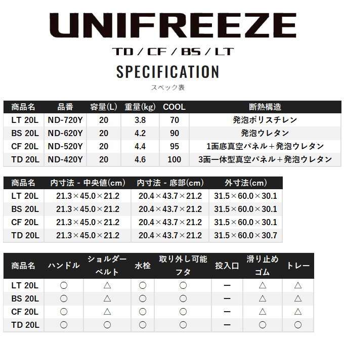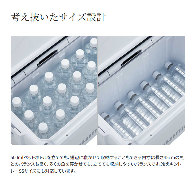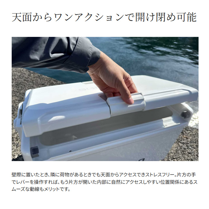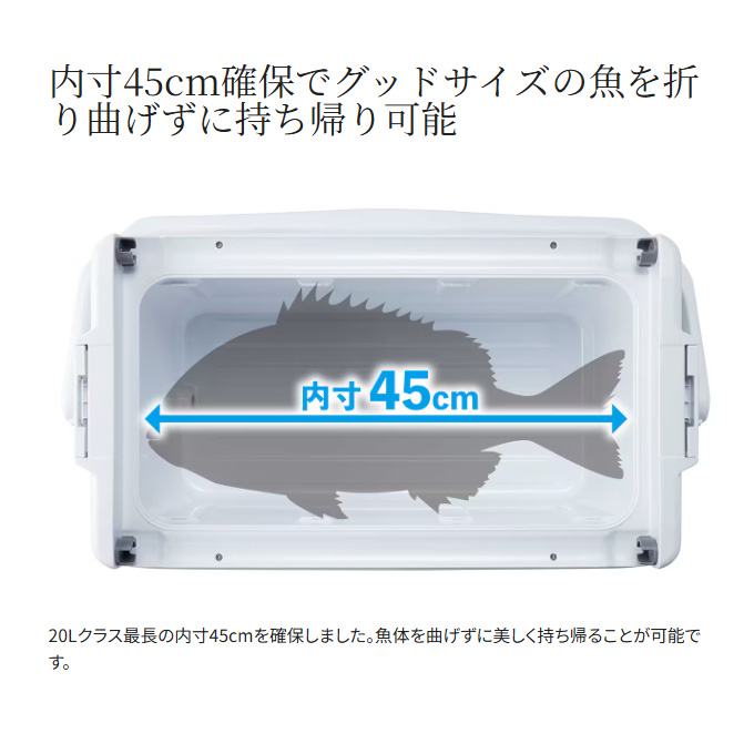 魚を持ち帰ることを考えた新定番の釣り用クーラーボックスです。20Lクラスでありながら内寸45cmを確保、グッドサイズの魚を折り曲げずに持ち帰ることができます。UNISHIELDを採用することで、密閉性を高め移動時の水漏れや冷気漏れを軽減。両面開きの蓋は横に物があってもアクセス可能。ワンタッチ跳ね上げ構造の水栓は紛失の心配がありません。洗った時の水残りのしにくさなど、釣り用クーラーボックスとしてのメンテナンス性も向上しました。船のエサ釣り、堤防、近海のインショアボートなど幅広く活躍します。優れたスペック、使い勝手とコストパフォーマンスの良さをこのボックスに詰め込みました。