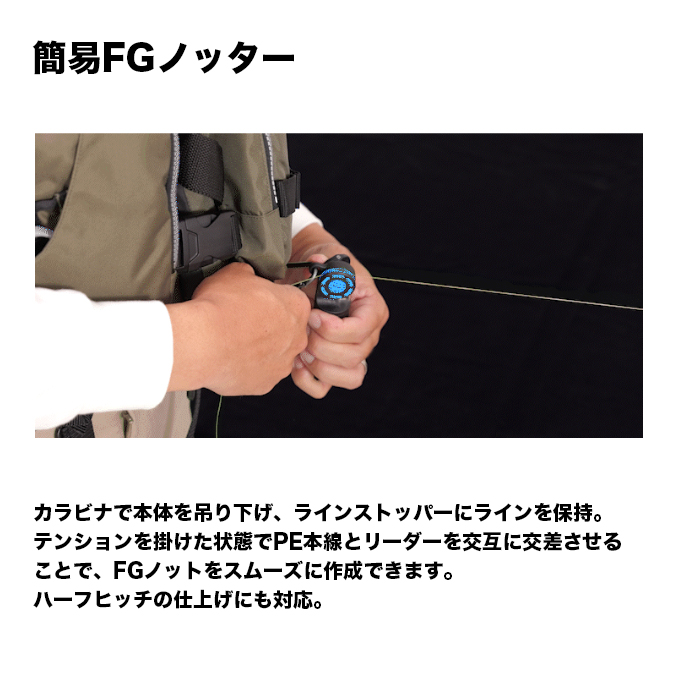 ワンタッチ糸留めはラインを仮留めでき、ハーフヒッチの仕上げや、そのままFGノットの作成にも対応。