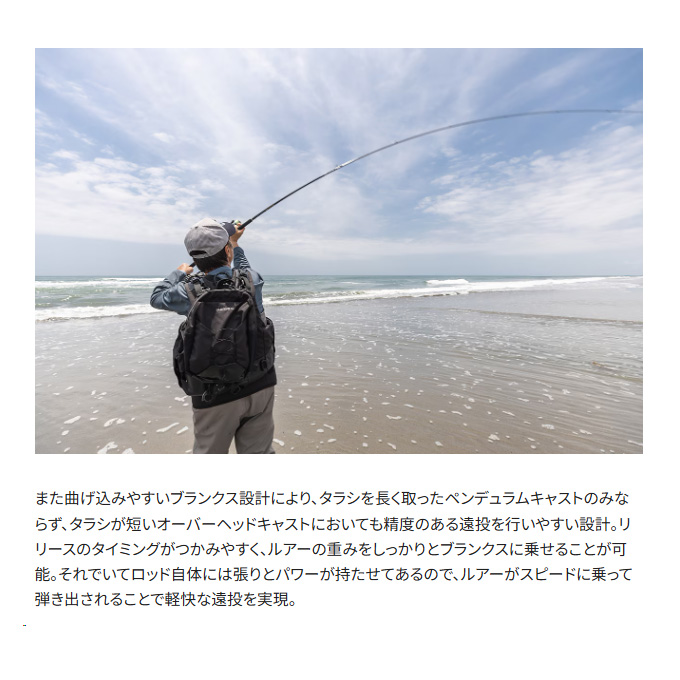 サーフゲームに求められる継続的なキャストを可能にする「曲げるブランクス」コンセプト。基本構造[スパイラルX]、強化構造[ハイパワーX]がロッドのネジレやつぶれを抑制。曲げ込みやすいブランクスとの相乗効果によって、足場の安定しないサーフシーンのキャストにおいて、リリースポイントがつかみやすく、安定した飛距離を実現。また、追従性のあるロッドアクションにより、ルアーリトリーブ時のエラーアクションを抑制。これにより、アングラーのルアーローテーションの幅が広がり、広大なサーフから戦略的にターゲットの反応を引き出すゲーム展開に貢献。