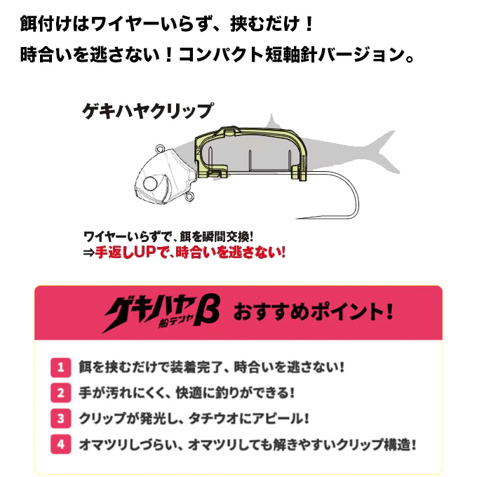 ●ワイヤーいらずで餌を間交換でき手返しUPで時合いを逃さないゲキハヤクリップ