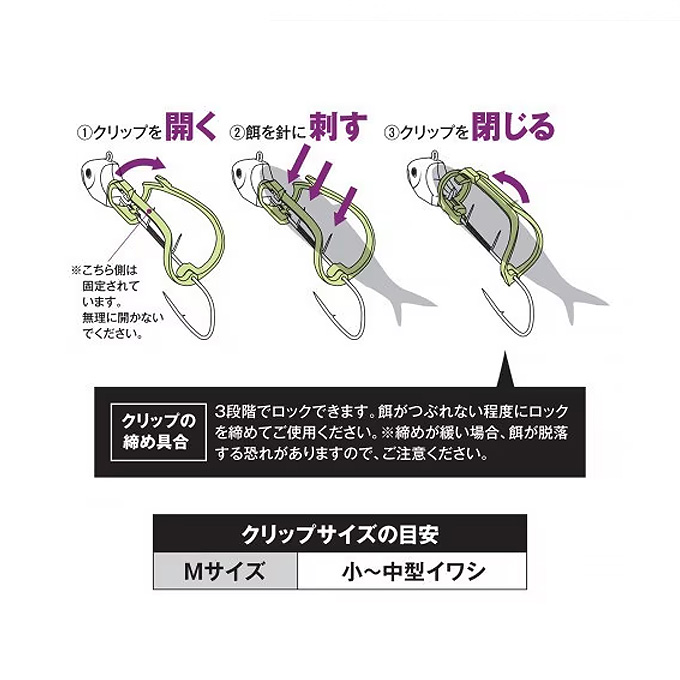 ●クリップ サイズの目安/Mサイズ : 小〜中型イワシ(※餌のサイズ、形状によっては固定できないものもございます。)