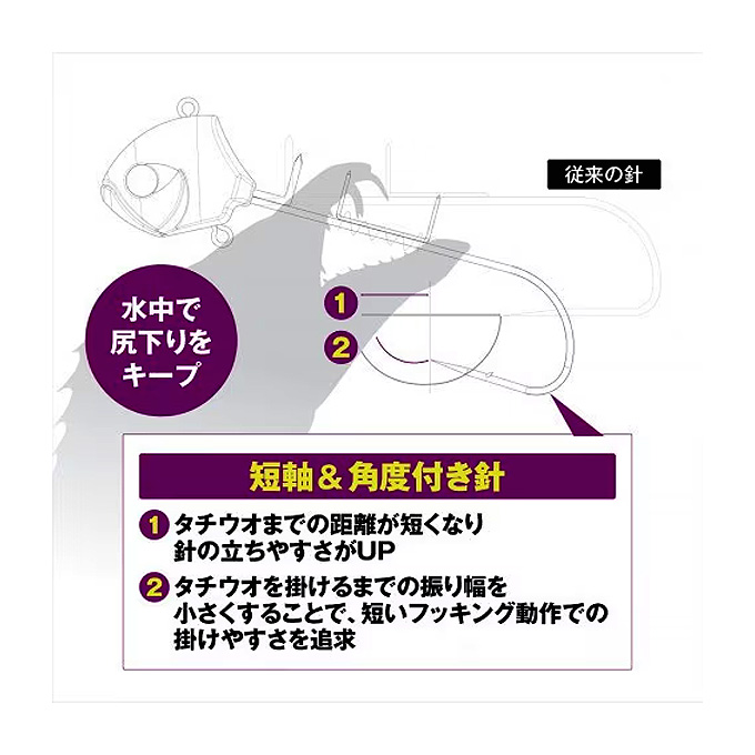 大きなエサとテンヤがアピール力を発揮することがあるように、エサとテンヤのシルエットが小さいほうがタチウオに警戒されずアタリが出ることがあります。激戦区や喰い渋り時はとくにその傾向が顕著に見られ、エサとテンヤのサイズは誘いのテクニックと同様、ときにそれ以上に釣果を左右します。サーベルマスター船テンヤβはヘッドの小型化、フックの短軸化により誕生したコンパクトなタチウオテンヤ。水中では尻下がり姿勢をキープするため最小限の動作でのフッキングが可能、即掛けはもちろんロッドでアワセず、リールの巻きで掛ける「巻掛」にも最適です。カラーは定番から流行、各地方で威力を発揮するカラーまで、最新の情報を踏まえた全10色。号数は30、40、50号をラインナップ。全国に広がるテンヤタチウオシーンをカバーします。