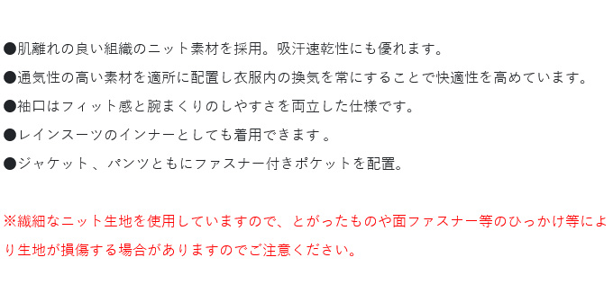 ●通気性の高い素材を適所に配置し衣服内の換気を常にすることで快適性を高めています。