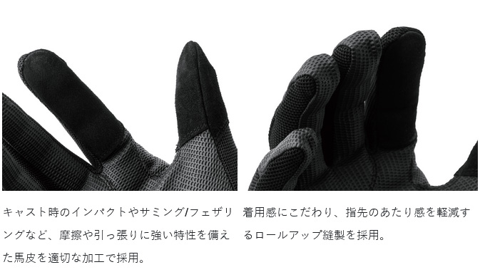●親指と人差指にはキャストやサミングに対する耐摩耗性に優れる天然皮革(馬革)を採用。