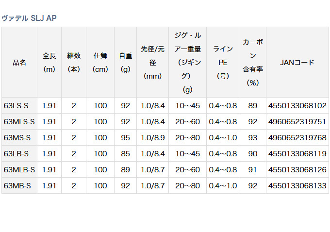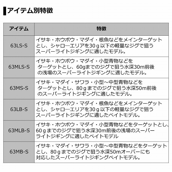 イサキ・ホウボウ・マダイ・根魚などをメインターゲットとし、シャローエリアを30g以下の軽量なジグで狙うスーパーライトジギングに適したモデル。その中でもベイトタイプは着底感度が良く、フォール中のバイトもフッキングに持ち込みやすい。
