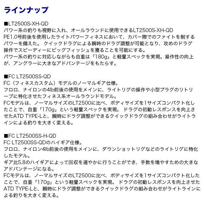 軽さと強さを両立するZAION V製のモノコックボディは、負荷が掛かった状態でもたわみや歪みを抑えて力強い巻き上げをアシスト。一方でZAION V製エアドライブローターの搭載により、低慣性化による軽い巻き出しも実現している。またドラグには、スムーズな滑り出しと安定した効きでラインへの負荷を低減するATD TYPE-Lを採用。少ないノブの回転で瞬時にテンションを調整できるクイックドラグとの相乗効果で、ライトライン使用時においても、バスとのファイトを楽しみつつスピーディにビッグフィッシュを獲ることを可能とした。