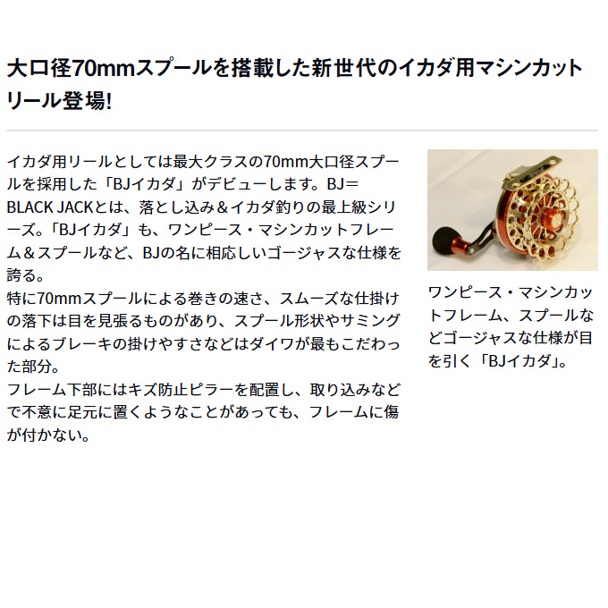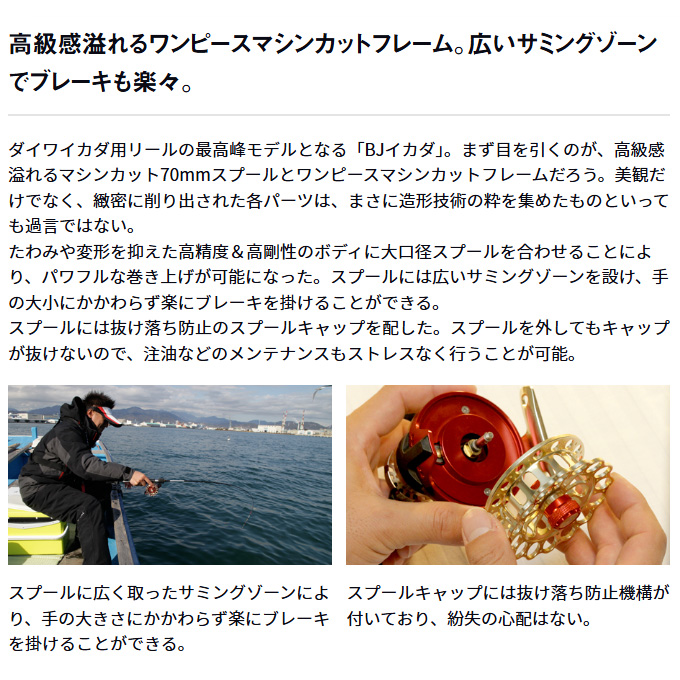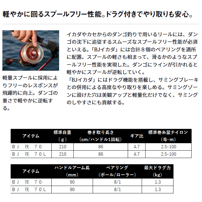 70mmの大口径スプールにギヤー比4.7とハイスペック仕様のイカダリールの登場。こだわりのサミングゾーンも搭載した新世代リール。